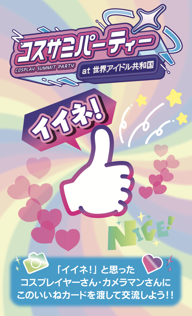 世界コスプレサミットでは、イベントに新たなコミュニケーション企画「いいねカード」 を導入します。これは、コスプレイベントの楽しみ方をより広げるためにWCSが独自に開発した、コスプレイヤー同士・そしてコスプレファン(フォトグラファー、コスプレ好き)の方々も気軽に交流を楽しめるツール です。